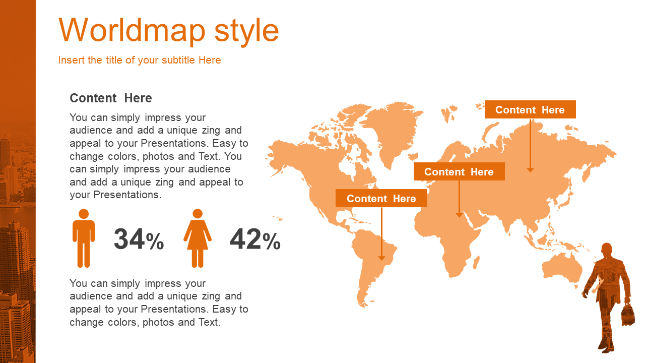City of Business Man PowerPoint Template overlaid red with a cityscape background. It also includes a slide background reminiscent of the city’s businesspeople.